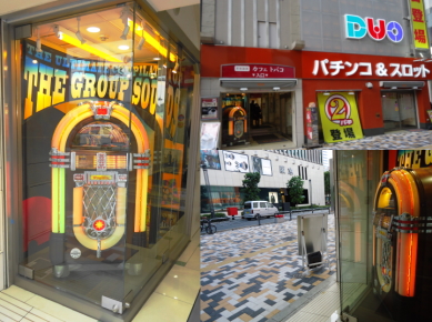 パチンコ&スロットDUO有楽町店入り口のガラス張りの部屋に設置されたOMT(ワンモアタイム)CD。周りには懐かしいグループサウンズのレコードジャケットが飾られ、実際にこのジュークボックスの演奏でBGMが流れています。向かい側は有楽町阪急です。![]() |